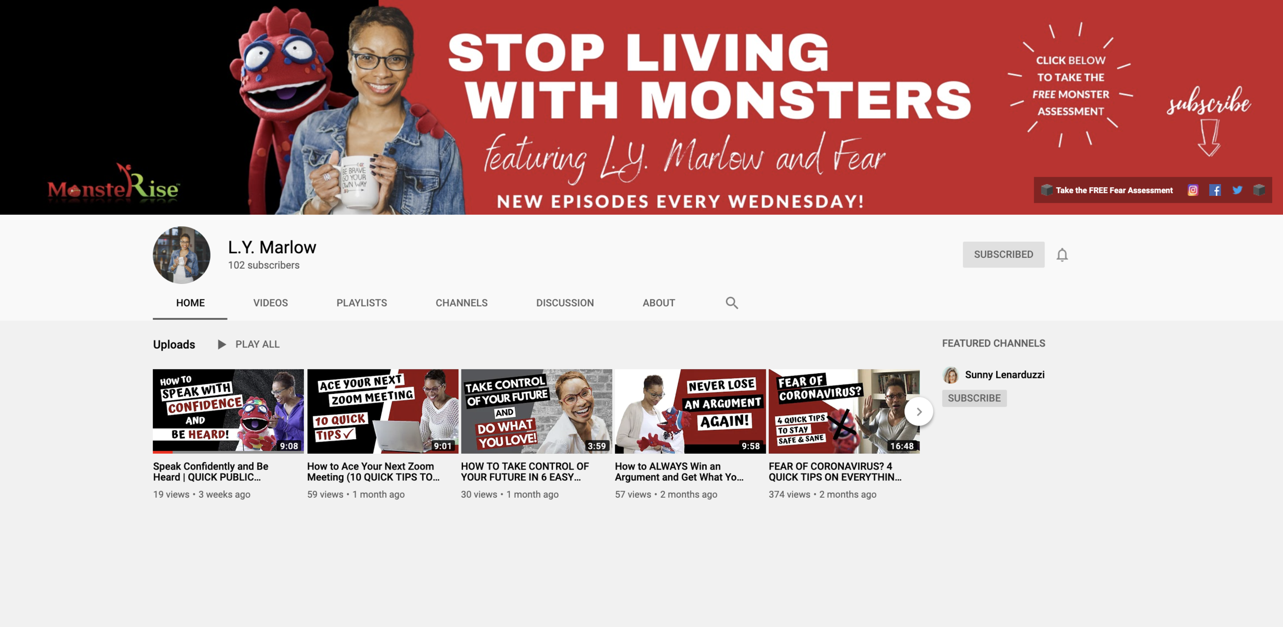 L.Y. Marlow is an author, speaker, and empowerment advocate. During my time as a contracted designer with L.Y., I helped establish her new brand, MonsteRise, from concept to finish. I began by developing a new site and launching the L.Y. Marlow YouTube channel, including filming and editing the videos. Within the first month, I helped grow the YouTube channel to over 100 subscribers. My other responsibilities included designing podcast title cards, YouTube video thumbnails, quote cards for social media, and other promotional documents and materials. To build the email list, I created branded informational guides and “freebies” for those who signed up, with the list reaching over 700 subscribers.